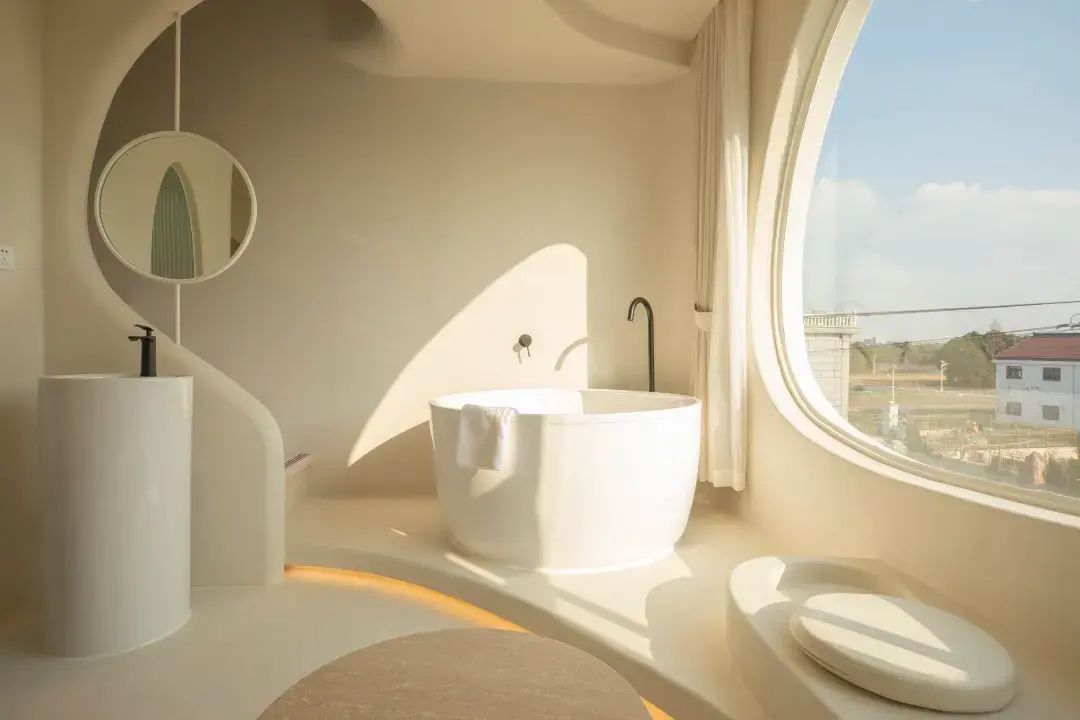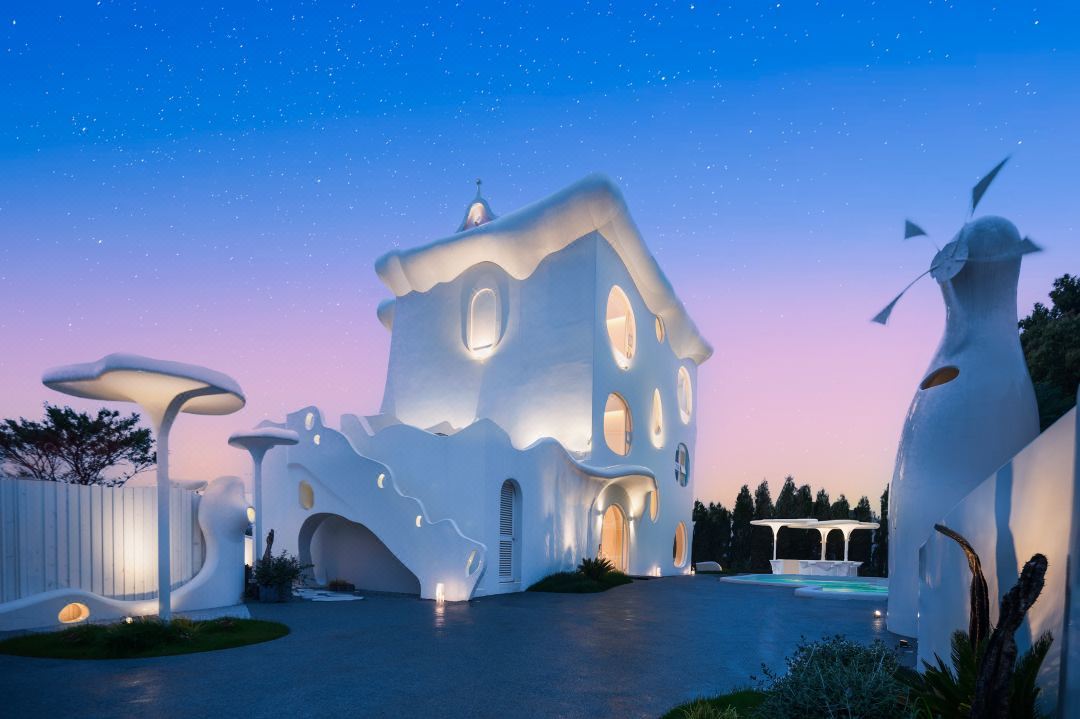 民宿选址于迪士尼度假区附近,一栋白色云朵般的城堡外观,在夕阳的映衬下,宛若成为了另一个童话城堡。客房和整体公区设计极具巧思且风格迥异,融入了有机和侘寂风,正印证了高迪的直线属于人类,曲线属于上帝。