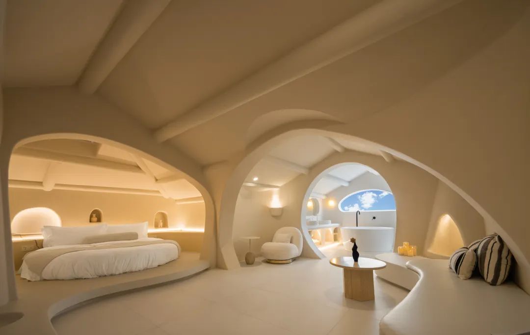 民宿选址于迪士尼度假区附近,一栋白色云朵般的城堡外观,在夕阳的映衬下,宛若成为了另一个童话城堡。客房和整体公区设计极具巧思且风格迥异,融入了有机和侘寂风,正印证了高迪的直线属于人类,曲线属于上帝。